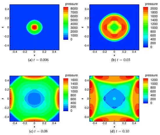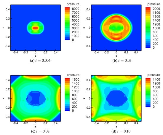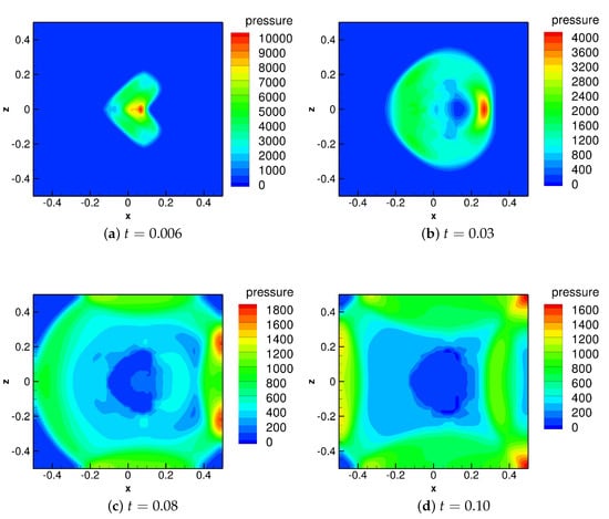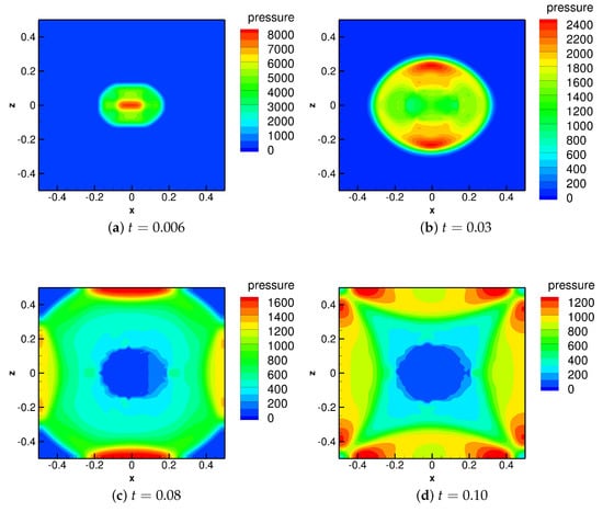 Later on, when the shock wave arrives at the lateral boundary of the computational domain at the time (Figure 2c), a reflection of the pressure occurs due to the existence of the solid wall, which results in a superimposition of the pressure. Consequently, a maximum of the pressure is achieved, and the peak value reaches 1530 at this time. Afterward, the shock wave reflected from the solid wall attenuates when propagating towards the bubble (see Figure 2d). The pressure peak has dropped to a value of 1075. In contrast to that, at the upper-left ( and ), upper-right ( and ), lower-left ( and ) and lower-right ( and ) boundaries of the computational domain, the initial shock wave has just arrived, forming a high-pressure region nearby. At this end stage of the simulation (), the volume of the bubble is about eight times the initial bubble due to the expansion of the explosive gas.