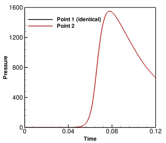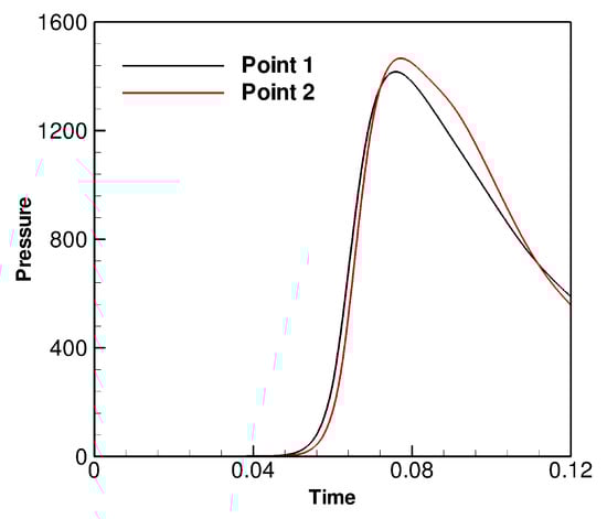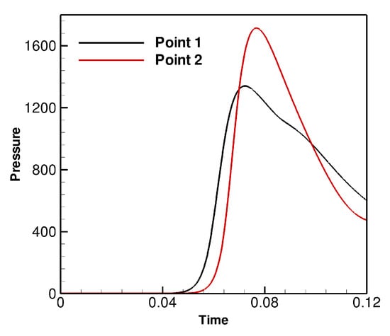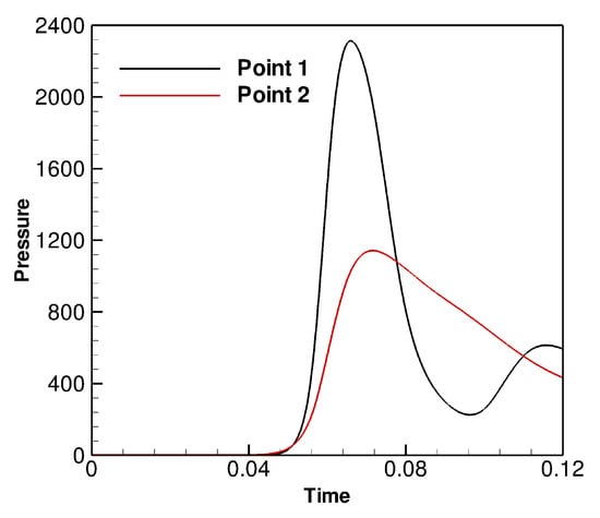 The time-dependent pressure curves obtained at the boundary points 1 and 2 are shown in Figure 3. It is seen that, due to the initial symmetrical shape of the bubble in this scenario, the time-pressure curves at these two points are identical. The pressure recorded at these two surface points start to increase rapidly at the time of about 0.06, due to the impingement of the initial shock wave on the boundaries. The peak value of the pressure is 1550 ( Pa), occurring at the time (corresponding to approximately 250 s after the initial explosion). Then, the pressure drops, at a rate of Pa s, reaching an amount less than 700 ( Pa) within the time of 0.04 (125 s).