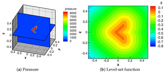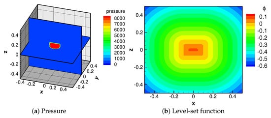 In this simulation scenario, the shape of the high-pressure bubble was varied to be cuboidal, whereas all other parameters were kept the same (Figure 7a). The distance from the lateral side of the cuboid-shaped bubble to the side boundary of the domain was still set to 0.4 m. The height of the cuboid was thus calculated as , where . The initial distribution of the level-set function is given in Appendix A. The principle of setting up this initial level-set function is to divide the computational domain into parts, and then define the level-set function in each part separately. Figure 7b gives a slice plot of the initial distribution of the signed distance function.