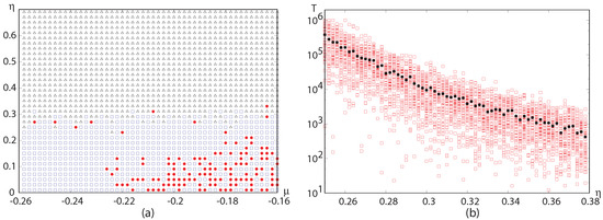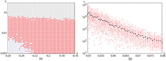 In Figure 3b, collapse time for exploding dissipative solitons under the influence of multiplicative noise is shown for . The average time scale T for collapse is plotted as a function of the noise strength . Black solid circles represent an average of over 50 realizations shown as open squares (□). One can see from the plot that decreasing at the border in 0.03 means to increase T in one decade.