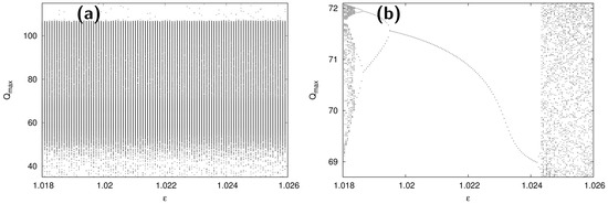 (a) Logistic map for without including higher-order effects. Complex picture, natural consequence of explosive chaotic behavior; (b) Logistic map for including higher-order effects. One can observe a window without chaos around .