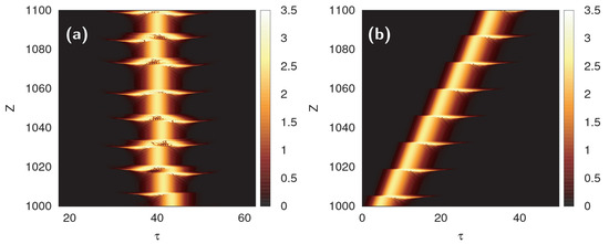 Figure 5b shows the evolution of the amplitude in a plot, for , considering higher-order nonlinear and dispersive effects. In contrast to Figure 5a, we see that there is a fixed distance in z between explosions and explosions repeat exactly after a period. We are in the presence of periodic explosions.