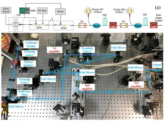 A schematic diagram of the experiment setup is depicted in Figure 1. Figure 1a shows the setup of the fiber stage, including a distributed feedback (DFB) laser with fiber-coupled output and two fiber amplifiers. The setup of the fiber stage was similar to that in [17]. The difference was that electro-optic modulator (EOM2) was replaced by an acousto-optic modulator (AOM, Gooch & Housego T-M200-0.1C2G-3-F2P, llminster, UK). The maximum rise/fall time of the AOM is 10 ns, and the maximum modulation frequency is 200 MHz. Its function was enhancing the extinction ratio and pulse contrast of the output pulses.