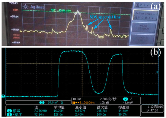 Due to the narrow spectral linewidth of the semiconductor laser, stimulated Brillouin scattering (SBS) could happen when the pulse energy increases. We carefully increased the pump power of the 2nd fiber amplifier and observed at the output end. When the average output power reached 22 mW at a pulse repetition rate of 100 kHz with a pulse duration of 168 ns, a strong backward SBS was generated. As shown in Figure 2b, a depression appeared in the middle of the shape, and the pulse shape was also unstable (see the uploaded video from Supplementary Materials). By introducing the optical spectrum analyzer (Agilent 86142B, Palo Alto, CA, USA), the frequency shift caused by SBS was evidently observed as shown in Figure 2a. The spectrum was also unstable (see the uploaded video from Supplementary Materials).
