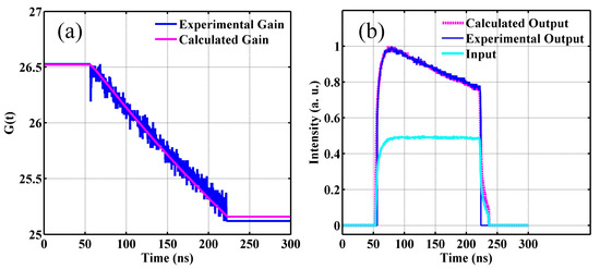 First, the small-signal gain was calculated through our model [19]. Since the stimulated emission section σes directly affects the gain integral, it is a key parameter for the small-signal gain. For Nd:YVO4 crystal, σes is strongly dependent on the boundary temperature [20,21]. We measured the temperature of the crystal at the pumping input end when the pump power was 56 W. The result was 120 °C, and σes was estimated to be 12.5 × 10−19 cm2 [21,22,23,24]. Therefore, we obtained the small-signal gain of the first solid-state stage as 40 dB by slice model [19]. By applying the iteration method [17], the initial pulse gain of 26.5 dB obtained only after 25 times, as depicted by Figure 3. The pulse shape transfer functions from experiment and simulation were plotted in Figure 4a, while the output pulse shapes from experiment and simulation with the same input pulse shape were plotted in Figure 4b. The simulated output power was 7.38 W, being consistent with the experimental one of 7.32 W. Comparing the experimental and simulated results, it was concluded that the theoretical method was very effective in calculating the gain characteristics and in obtaining the pulse shape transfer function.