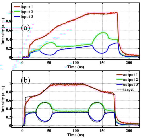 To test the capability of compensating pulse distortion and obtain car-shaped pulse shapes, the input pulses were theoretically obtained by the desired output pulse shapes and G(t). With the same amplifier setup, the pulse shape transfer function was the same as that in Figure 4. As shown in Figure 5a, for the input pulses, the leading edges’ amplitude values were smaller than those of the trailing edges. As the gain of the leading edges were larger than that of the trailing edges, the output shapes were car-shaped, as plotted in Figure 5b. Comparing the target pulse shapes (in black dot lines) and the experimental one, they are in good accordance with each other. As for the output power of the three pulse shapes, they were all equal to 7.3 W with identical input powers of 19.5 mW.