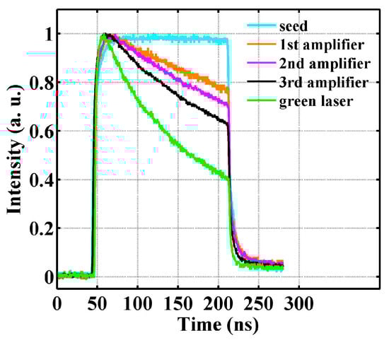 The pulse shapes were recorded for each amplifier as shown in Figure 6. The pulse shape distorted after each amplifier resulting from different gains for the leading and trailing edge. The leading edge first consumes the inversion population resulting in a smaller gain for the falling edge and then pulse distortion.
