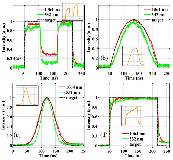Desired pulse shapes for the 1064 nm and 532 nm at a PRF of 100 kHz. Target is for 1064 nm. (a) Multiple-step; (b) Parabolic; (c) Gaussian; (d) Square. (Input pulse shape is given in the inset).