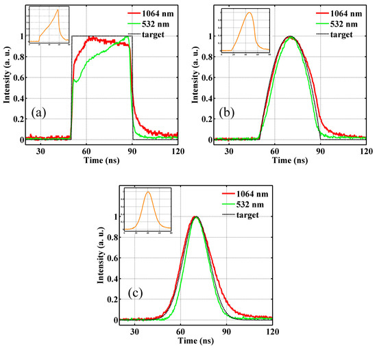 Desired pulse shapes for the 1064 nm and 532 nm at a PRF of 40 kHz. Target is for 1064 nm. (a) Square; (b) Parabolic; (c) Gaussian. (Input pulse shape is given in the inset).