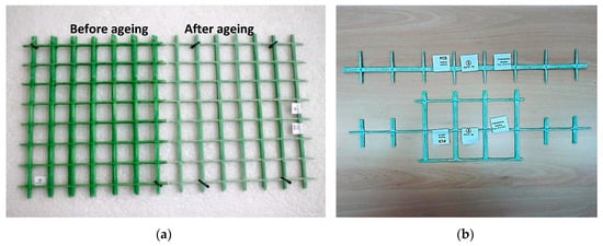 GFRP grids after exposure in alkaline bath. (a) Comparison between aged and unaged grid; (b) Aged specimens.