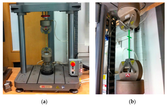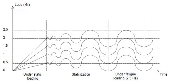 Fatigue tests were performed on a servo-hydraulic E3000 Instron machine (Instron, Norwood, MA, USA) with a 3 kN capacity load cell. Surface temperature was monitored using a voltmeter with a sensibility of 0.15 °C. The load amplitude and test frequency of the fatigue treatment were constant (1.0 kN and 7.5 Hz, respectively). Tests were conducted at a room temperature of 21 °C in stress control using a normalized maximum tensile stress (σmax/σult) of approx. 0.25, 0.35, 0.45 and 0.55 (corresponding to maximum tensile loads of 1, 1.5, 2, and 2.5 kN). Table 1 summarizes the experimental program of tensile static tests, while in Table 2 the fatigue test protocol is illustrated, including the number of specimens tested, the maximum fatigue load and number of scheduled cycles. In Figure 5 and Figure 6 the fatigue machine and the loading histories used in this study are illustrated.