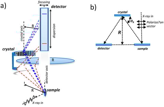 (a) Schematic of the von Hamos spectrometer layout employing segmented crystals for X-ray diffraction in a vertical scattering geometry; (b) Schematic view of the spectrometer geometry along the dispersive axis as applied to inelastic X-ray scattering (IXS) studies.