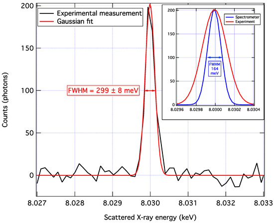 In the present experiment, we used an Si(111) crystal glued to a cylindrically shaped support. The crystal consists of 100 segments, each 1 × 50 mm (focusing × dispersion) size, and a radius of curvature of the support of 250 mm. The diffracted X-rays were measured by means of either a two-dimensional Pilatus 100 K detector [29,30] consisting of 195 × 490 pixels with 172 × 172 μm2 size, or a Mythen strip detector consisting of a linear array of 1280 pixels of dimension 50 µm × 8 mm [31,32]. Both detectors are photon-counting, so all reported signals are directly in counted photons. To measure the IXS signals, the spectrometer was operated at a Bragg angle (marked as ΘB in Figure 1b) of around 80 degrees and Si(444) diffraction, and arranged in the backscattering geometry. Using such a setup, the spectrometer could record X-rays of energy around 8030 eV and a dispersive energy bandwidth of 80 eV. The incident X-ray beam was delivered by an Si(311) monochromator and focused down to a size of 100 × 100 μm2 onto the sample position by means of a Pt-coated mirror. The higher energy X-rays were rejected by primary Si mirror operated at an angle of 3 mrad. The experimental resolution, measured from the full-width at half maximum (FWHM) of elastically scattered photons from a piece of solid Pb, was found to be 300 meV (see Figure 2), indicating that the main broadening contribution is from the Si(311) monochromator bandwidth (250 meV), while the influence from the spectrometer is substantially smaller. The experimental data were fitted with the convolution of two Gauss functions representing the contributions of experimental broadening from the incidence beam and spectrometer, respectively. In the fit, the FWHM of the incidence beam was fixed to 250 meV and the width of the spectrometer contribution was left as a free parameter. From this procedure, the FWHM of the spectrometer contribution was found to be 164 meV, which includes all other contributions to the experimental energy resolution [5]. The primary reason for this improved spectrometer resolution, in comparison to previous results, is due to the decreased segment size from 5 to 1 mm, which reduces the geometric contribution to the energy resolution [5].
