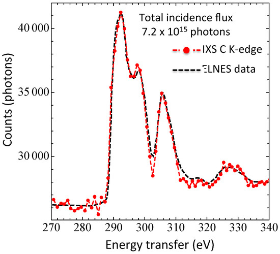 The IXS measurement of the C K-edge recorded from a chemical vapor deposition (CVD) diamond sample with the von Hamos spectrometer is plotted in Figure 3. The incident beam energy was set to 8350 eV. The spectrum is shifted in energy according to the energy conservation rule, in order to be compared with experimental data recorded by means of Electron Loss Near Edge Spectroscopy (ELNES) [33,34]. As shown, excellent agreement is obtained between the spectra. A total incident photon flux of around 1015–1016 photons was needed to record a good quality IXS signal. Following the ELNES and XAS experimental and theoretical interpretation, the first peak at around 292 eV corresponds to 1s→σ* excitation, while the features from 295–310 eV relate to σ-type unoccupied states, and the peak at 328 eV is the first EXAFS feature.