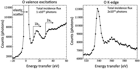 One of the significant advantages of the IXS technique is the ability to probe bulk samples, such as liquid water. The oxygen IXS signals from water are shown in Figure 5. The O K-edge measurement (Figure 5 right) shows the characteristic XAS and EXAFS of liquid water [35,36,37], with no contribution from the gas-phase species [38], as expected for a bulk measurement. As for the Ti sample, the dispersive spectrometer can also easily access higher-lying excitations, in this case excitations from the 1b2 and 2a1 molecular orbitals of the water molecule [39]. In general, these types of excitations are measured using photoemission, which requires vacuum techniques to be applied [40]. Here, we measure the signals from the bulk liquid under ambient atmospheric conditions.