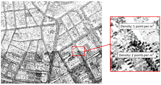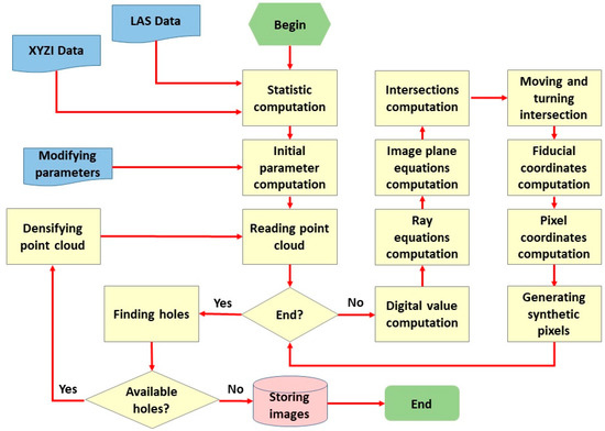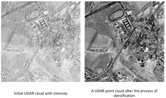 The LiDARgrammetry technique is based on the inverse algorithm of the photogrammetric technique, which is namely the 3D dataset (point cloud) that is used to generate 2D information (synthetic images). Therefore, the resolution and definition of the images depend on the density (points per square meters) and radiometric characteristics (intensity level) of the LiDAR dataset as well as the resampling algorithm used. The images are generated as if they had been registered at a given position using the “base–height” ratio related to the dataset’s parameters, which are used as a base reference.