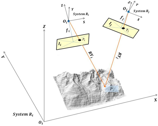 We selected a zone with no points in the left image called with neighbor pixels in this image (once we complete the process with the left image, we apply the same process to the right image) with pixel coordinates and intensity level Following this, we obtained the ground coordinates for all points, which are previously calculated in the process of generating the synthetic image as there is one unique correspondence between all points in the cloud, all points in image and all points in image . Following this, we created a new point (in the center of all points) with ground coordinates and intensity level , using the mean intensity level of all points for digital value of intensity. After this, we have the new point , and, then, we can obtain pixel coordinates in both images and We repeated this process as many times as necessary to get a well-distributed point cloud. The point cloud has a new point called and the synthetic images are generated again with the initial point cloud in addition to the set of interpolated points created. Obviously, the holes are filled in both images.