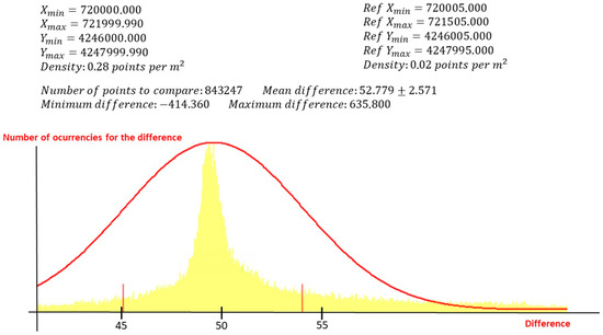 , UTM 30N datum WGS84) to obtain the difference in a total of 843,247 points. This is seen in the histogram of