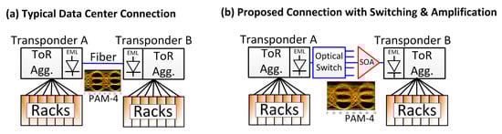 Figure 1. (a) Simplified schematic showing communication between two clusters of racks in a datacenter. The transponders use externally modulated lasers (EML) to communicate at up to 400 Gbit/s between the top of the rack aggregators (ToR Agg.); (b) Proposed use of semiconductor optical amplifiers (SOA) as a pre-amplifier to overcome losses within an optical switch. Eyediagrams of the simulated PAM4 signals are shown, in (b) a slightly distorted eyediagram due to the SOA nonlinearities are shown.