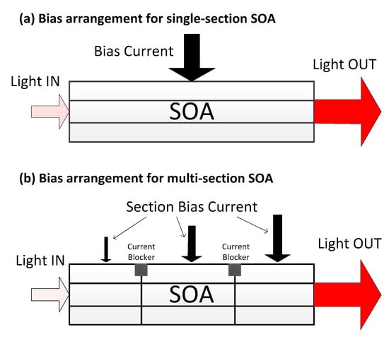 20. Carney, K.; Lennox, R.; Watts, R.; Philippe, S.; Bradley, L.; Landais, P. Short pulse transmission characteristics in multi-contact SOA. In Proceedings of the 2012 14th International Conference on Transparent Optical Networks (ICTON), Coventry, UK, 2–5 July 2012. [Google Scholar]