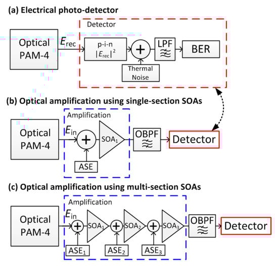 Figure 3. Simulation scenarios performed in this submission. (a) Linear receiver with PIN photodiode including thermal noise. LPF: Lowpass filter; (b) Pre-amplified PAM4 signal using an SOA. ASE is added before SOA, the receiver is as in (a); (c) multi-section SOA, the SOA is split into three separate SOA subsections, ASE noise is added before each SOA subsection. Adjusting the bias can alter the NF and saturation power of each subsection. The detector is as in (a).