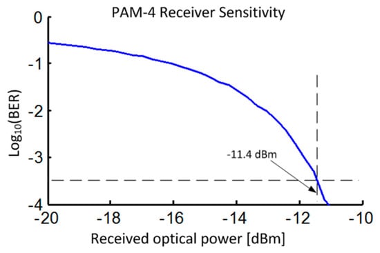 The amount of thermal noise remains fixed and the BER changes by changing the received signal power | E r e c | 2 . We calculate the BER for different values of received optical signal power with the results shown in Figure 4. We indicate the sensitivity to achieve a BER of 3.16 × 10−4 because this is the BER at which the forward error correction algorithms can effectively yield error-free performance [2]. The received power that attains a BER of 3.16 × 10−4 is estimated to be −11.4 dBm, which is in line with an experimentally obtained sensitivity of −10.8 dBm [15], and within an acceptable range for receiver sensitivity. Reducing the responsivity of the photodiode to 0.7 would add +1.5 dB to our calculated receiver sensitivity. The detector model is central to all of our simulations and we use the detector model after amplifying the signal in an SOA.