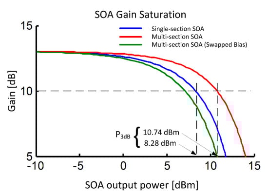 11. Carney, K.; Lennox, R.; Maldonado-Basilio, R.; Philippe, S.; Surre, F.; Bradley, L.; Landais, P. Method to improve the noise figure and saturation power in multi-contact semiconductor optical amplifiers: Simulation and experiment. Opt. Express 2013, 21, 7180–7195. [Google Scholar] [CrossRef] [PubMed]