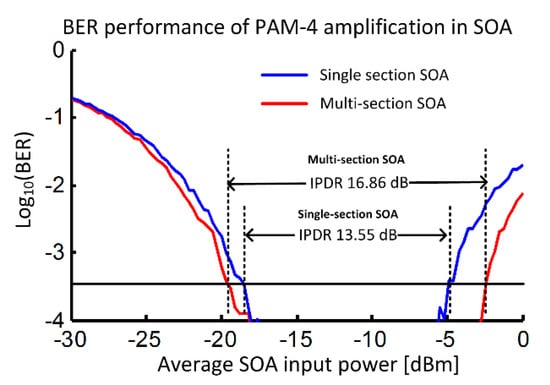 We showed that the BER performance of pre-amplified PAM4 signals can be modeled using simple, fundamental concepts to produce results that are in agreement with experimental results. Our results show that a multi-section SOA could improve the amplification dynamic range by over 3 dB through improved noise performance and through less gain saturation than an equivalent single-section SOA. Even though we have used one specific set of SOA parameters, the results presented would be applicable to SOAs with different parameters for the following reasons. Firstly, the NFs are typical of SOAs and the SOA noise depends mainly on the gain-inversion parameter [22], therefore knowledge of the NF will allow the signal to noise ratio (or/hence BER) at low input signal powers to be calculated. Secondly, for amplification purposes, SOAs with a moderate gain of about 13 dB gain to avoid excessive gain saturation that is limited by the SOA saturation power. Finally, the IPDR is maximized by employing SOAs with moderate gain of 13 dB to 15 dB. In this work, we solely focused on simulating SOAs with a moderate gain of 13 dB. SOAs with high unsaturated gain will have smaller IPDRs because of the smaller upper power limit at which the BER performance will be limited by the gain saturation. For multi-channel amplification, the BER performances for a single wavelength channel and for low-power multi-channels are in agreement with experiments. The true nature of the gain saturation, especially the wavelength dependence of the gain saturation, needs to be investigated further because there may be an optimal spectral placement of the signals with channel spacings of the order of 100 GHz that would allow for improved multi-channel performance when amplifying using SOAs and thus may enable greater routing flexibility in future datacom networks.
