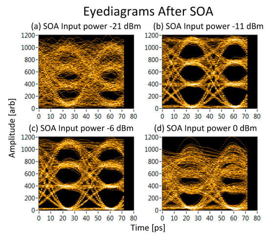 Figure 7. We display eyediagrams derived from the output intensity waveforms from the SOA. The eyediagrams are taken over a wide range of input power levels to the SOA in order to display different signal impairments. (a) −21 dBm; in this power regime the ASE noise dominates, note the larger splitting of the upper stronger PAM4 symbols due to signal-spontaneous beat noise; (b) −11 dBm; the eyediagram is clearly open with four distinct levels and no errors were detected in the 20,000 symbols used in the simulation. In this power regime, the signal is strong enough to overcome the ASE noise added by the SOA while being weak enough to not induce nonlinear gain saturation; (c) −6 dBm; in this power regime, there is little influence of the ASE though the signal is just strong enough to begin inducing distortions by saturating the gain of the amplifier; (d) 0 dBm; in this power regime, the clearly visible signal distortions are due to strong gain saturation within the SOA.