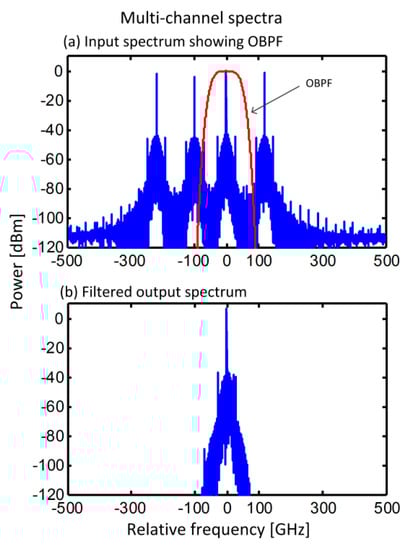 Figure 8. (a) SOA input spectrum showing four wavelength channels modulated with PAM4 data. The average power per channel is 1 mW. The BER estimates are performed on the channel that has been filtered out using the OBPF shown in red. (b) Spectrum of the filtered signal at the SOA output showing strong rejection of neighboring channels.