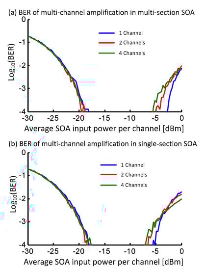 Figure 9. BER performance multi-channel PAM4 amplification performance in (a) multi-section SOA and (b) single-section SOA. Results are presented for one, two, and four co-propagating channels. At low input powers below −15 dBm, the ASE of the SOAs dominates and the performance is independent of the number of channels. The multi-section SOA performs better due to the lower effective NF. At high input powers above −10 dBm, there is a reduction in the useful dynamic range due to the increased crosstalk from the co-propagating channels.
