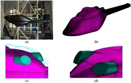 For the grid around the Ansat-P fuselage, the (ICEM)-hexa software of ANSYSTM mesh generation tool has been used. The length of the wind tunnel model (Figure 1a) was = 1.8 m. The computational grid for this model contained 964 blocks and 13.5 × 106 cells. The surface grid and grid details are shown in Figure 1b–d.