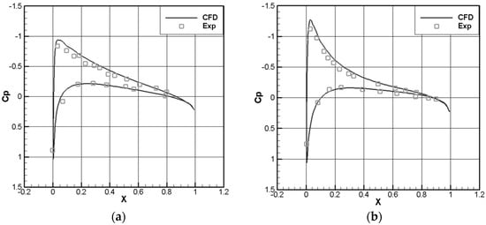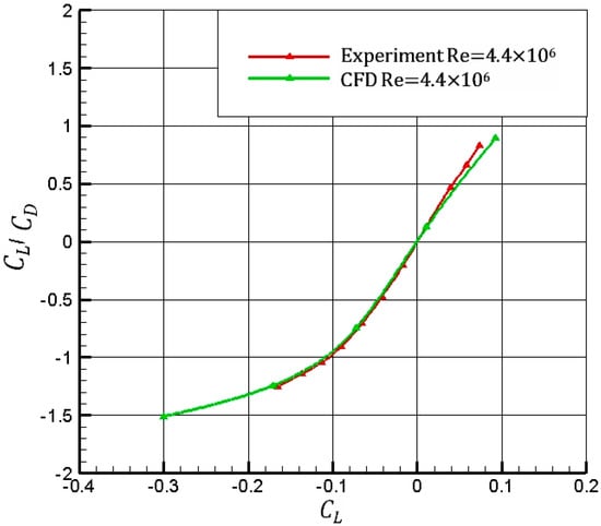 Figure 2 suggests a good agreement between CFD and experimental results for the lift () and drag () coefficients in the considered range of pitch angles.