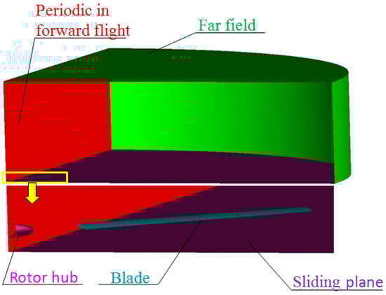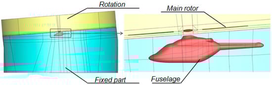 Rotor-fuselage flow simulations are also considered in this paper. For the simulation of the rotor over the fuselage, a sliding surface is constructed that divides the computational domain into two parts (Figure 4). The movable upper part corresponds to the rotor, that includes four-blades made of NACA 23012 airfoils with the root cut-off r = 0.2R, where R is the radius of the rotor. A simplified elliptical hub is used. The geometry of the upper part is inclined to allow forward tilting of the rotor.