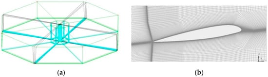 The computational grid of the rotor was assembled in several stages. At the first stage, the computational grid for a quarter of the computational domain (for one blade) was generated, as shown in Figure 5. The computational grid for each blade comprises 144 blocks and 6 × cells.