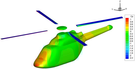 Surface pressure coefficient on the fuselage and blades at the conditions of Table 1.