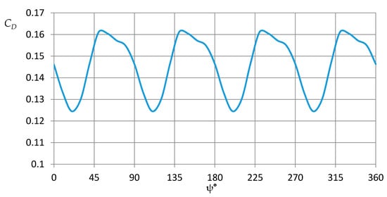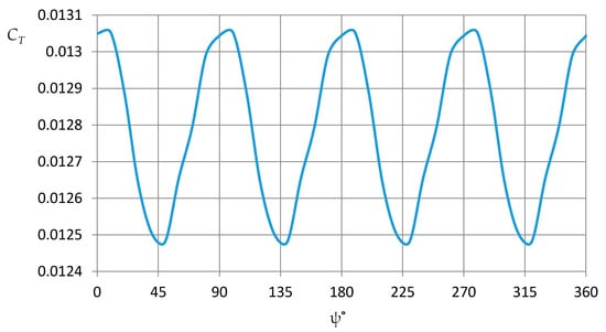 The value of the thrust coefficient also changes during the rotation of the rotor (Figure 9). The oscillation amplitude reaches 2.25% of the mean.