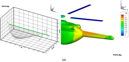 Based on the results of the CFD simulation of the rotor-fuselage interaction, the normal force coefficient was determined in the form , where are trigonometric functions. From Figure 10, it follows that , , . The results of Figure 11 and the function (expression (2)) were used to determine the function . In this case, the function has to satisfy to the condition . So, an approximation of the function in (15) was taken here as