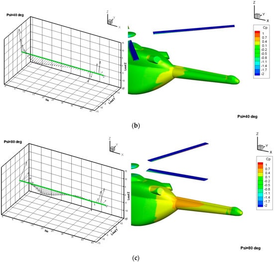Load Z and Load Y present sectional forces along the tail boom projected in the vertical (Z) and lateral directions for different azimuthal positions: (a) ψ = 0°, (b) ψ = 40°, (c) ψ = 80°.