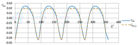 where , , , rad (N = 4 is the number of blades). Using a harmonic function (cosine) in expression (2) captures the periodic character of the tail-boom load. The parameter allows for correction of the peak to peak amplitude and the parameters determine the shift of the function with respect to the azimuth axis. The parameters were fitted to ensure The function is shown in Figure 11 in comparison to the function .