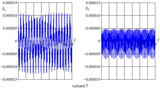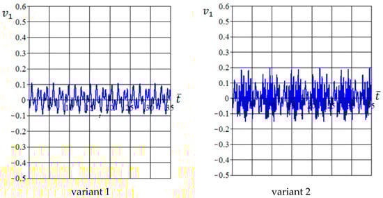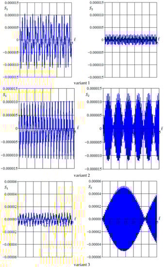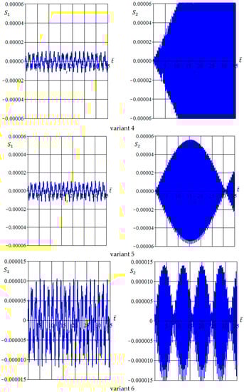 In general, one can note that the interaction between eigen and forced vibrations leads to two oscillation types having short () and long () dimensionless periods. Thus, all considered variants can be divided into two cases. Case I includes variants 1 and 6, for which , and case II includes variants 2–5, for which .