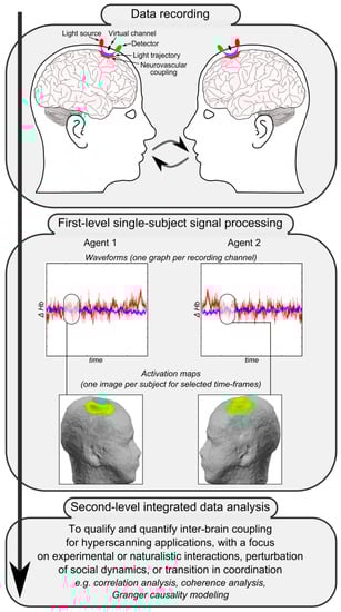 As underlined by Babiloni and Astolfi [21], the availability of a complex set of data constituted by the recording of brain activity from multiple co-acting or interacting individuals allows for the investigation of not only the association or dependence between brain activity and behavior within each agent (first-level analyses), but also the investigation of associations and dependencies between brain activity of various inter-agents (second-level integrated analyses, see Figure 2). Such an opportunity, however, opens new questions on proper analysis tools and approaches to quantify and qualify those potential associations. Answers to those questions have been found, to date, by looking at procedures and algorithms used to explore functional connectivity. The term functional connectivity defines statistical associations between physiological responses or activation patterns of distributed neural structures, without any stringent assumption or constraint concerning the actual existence of a structural connection between them (an assumption that could never be met when analysing the consistency of data series from different people). As a consequence, a key feature of functional connectivity is that it is strongly time-dependent. In other words, even if the pattern of statistical associations can arise in multiple time scales and may present only for short time windows, a consistency in the time course of different series of data needs to be present. However, as within-individual statistical associations are typically estimated via correlation, spectral coherence, or phase-locking analyses, novel methods had to be defined to focus on inter-individual analysis, since traditional methods assume that data concerns different facets of the activity of the same system.