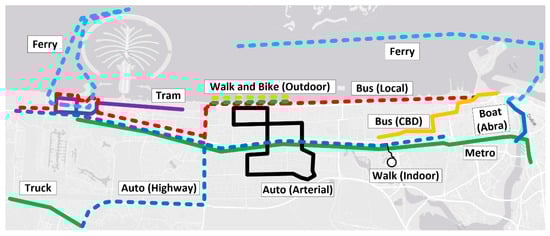 - Representative routes of Dubai should share as many modes as possible in order for the different modes to experience similar physical surrounding conditions nearby so that the proposed ANN’s distinguishing power can focus on the characteristic variances among the different modes.