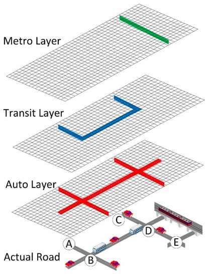 On a particular section of parallel roads, there are only a certain number of modes available and ANNs can utilize this additional input which can further aid the ANNs classifying capabilities. In this paper, a newly-developed type of GIS map layer in raster format, which contains binary (1 for available and 0 for not-available state) information is created. Mode-specific vector map layers are generated by selecting a particular subset of road networks corresponding to the availability of the mode throughout the map. Then, the newly-generated vector map is transformed into a raster map with 10 m × 10 m cells, where cells within a 100-m buffer of the road networks available with the particular mode are turned on. Once the newly-formed mode availability (MA) layers are prepared and ready to be accessed for each mode, raw data associated with any particular coordinates of GPS data from the field can be matched against those MA layers for checking the availability of each mode at that location (i.e., geocentric coordinates of x, y, z). This would form a new set of binary input factors to further aid the mode detection processes with ANNs. Figure 4 illustrates the concept of MA layers for each mode in a raster format. An auto mode is enabled in all sections in Figure 4 while the transit mode is available via points A-B-D-C and the metro mode is available via points C-D-E.