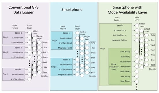 Figure 5 shows the designs of ANNs for the universal mode detection for all modes of transportation based on their physical characteristics. Auto mode would typically experience the highest maximum speed, while transit buses would frequently accelerate and decelerate even during free-flow periods for serving transit stops. As Table 2 suggests, a boat mode would have a clearer view of the sky and “see” a greater number of satellites. In all of the above cases, observing a single particular set of data is not sufficient for reliably detecting the mode, as Li et al. [24] suggest. By making observations for a longer duration of time and sampling the data more frequently, it would give more opportunities for ANNs to capture particular sets of patterns for each mode and make more reliable mode estimations. In this scenario, 10 min of monitoring duration with five data samplings, also known as “pings”, are used for all three approaches of DL, SP, and MAGIS.