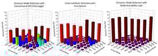 Table 3 and Figure 6 show the results from the universal mode detection using DL, SP, and MAGIS approaches. All three results show the highest values in its main diagonals, meaning that the proposed ANNs are detecting the correct modes the most among other modes. However, the mode detection rates of DL are the lowest among the three methods, probably due to its estimated acceleration values and lacking newly-available emerging input values from smartphones. The MAGIS performs significantly better than DL and SP methods due to its additional input factors from smartphone sensors and the binary input variables prepared from MA layers.