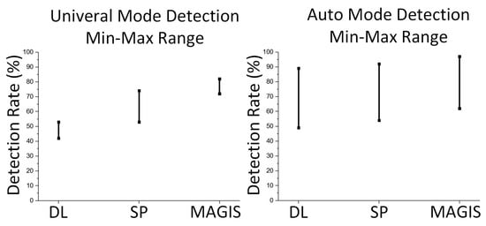 Results of universal mode detection rates (%) with DL, SP, and MAGIS.