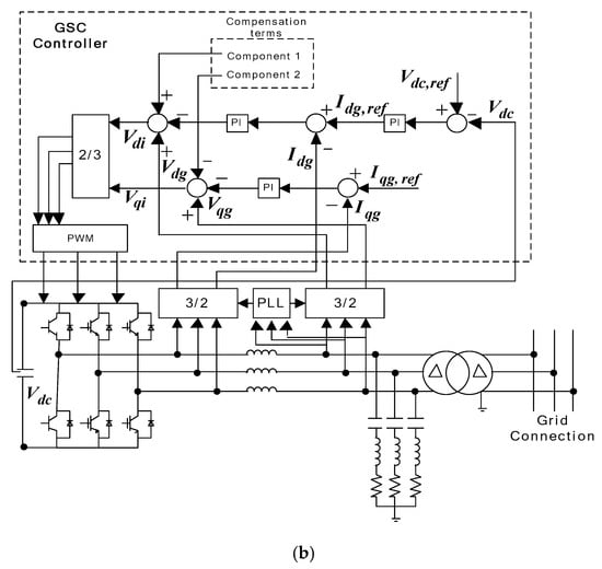 As shown in Figure 1b, GSC control maintains a constant DC link voltage regardless of the magnitude of PMSG power and generates any reactive power to obtain a power factor of unity. To develop the control mode for GSC, a vector control method is applied with a reference frame of the grid voltage, utilizing independent control of the active power and reactive power between the GSC and grid.