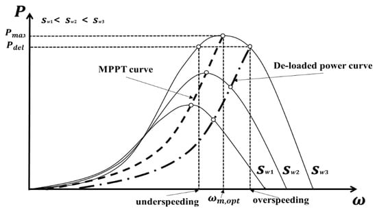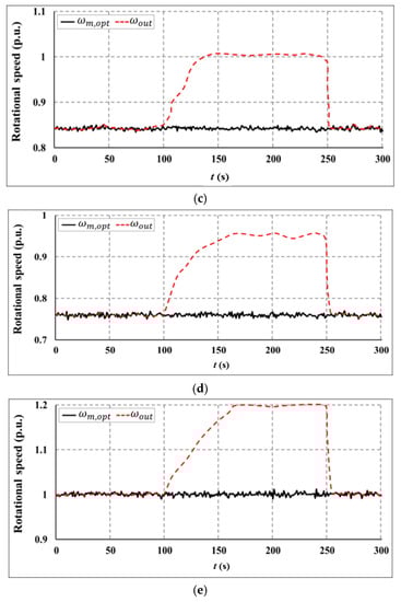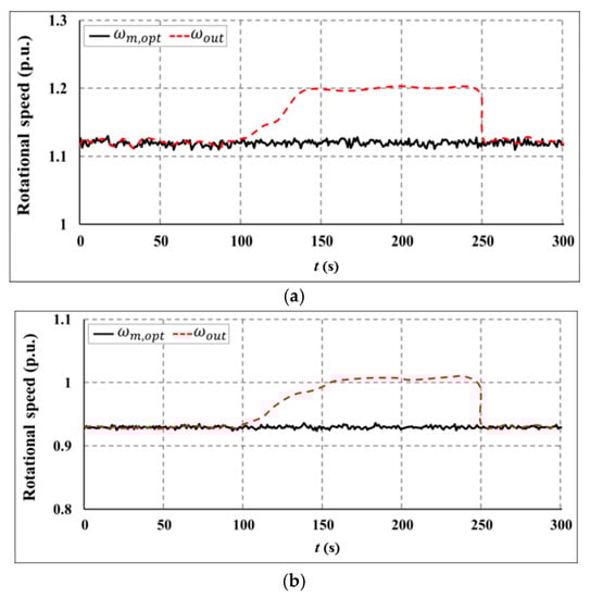When the wind turbines operate at the proposed de-loaded control, the output of the PMSG wind turbine is kept constant according to the de-loaded power reference. Thus, the sum of the de-loaded references of individual wind turbine generators, Pdel,i should be equal to the output of the wind farms according to the output command of the system operator Pref,wf, which sets the output of the wind farm for stable system operation. The minimum possible power is defined in the range that can maintain stable wind power operation for a given wind speed. When a wind turbine is operated in the de-loaded control mode, the rotational speed reference must be determined within the range of constraints. From Equation (25), the minimum rotational speed is limited from the optimal rotational speed in the MPPT control mode, and the maximum rotational speed of all wind turbines is set to the rotational speed reference of pitch angle control.