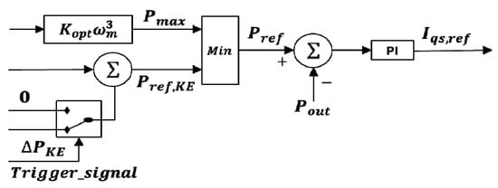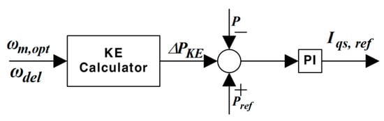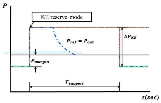 Figure 4 shows a diagram of the proposed KE reserve control method. de-loaded control makes the rotational speed increased with to the optimal rotational speed for a given wind speed, and it means that the KE stored in rotating masses is also increased when PMSG system is de-loaded. Figure 5 shows the KE reserve controller. If the frequency decreases because of frequency disturbance in the power system, de-loaded control mode switches to KE reserve mode using KE reserve control. This change immediately increases the output Pdel of the PMSG as the power increment ∆PKE, and maintains its output by participating in frequency regulation during a support time Tsupport. In other words, Pout is increased by ∆PKE and the rotational speed decreases because of KE reserve control.